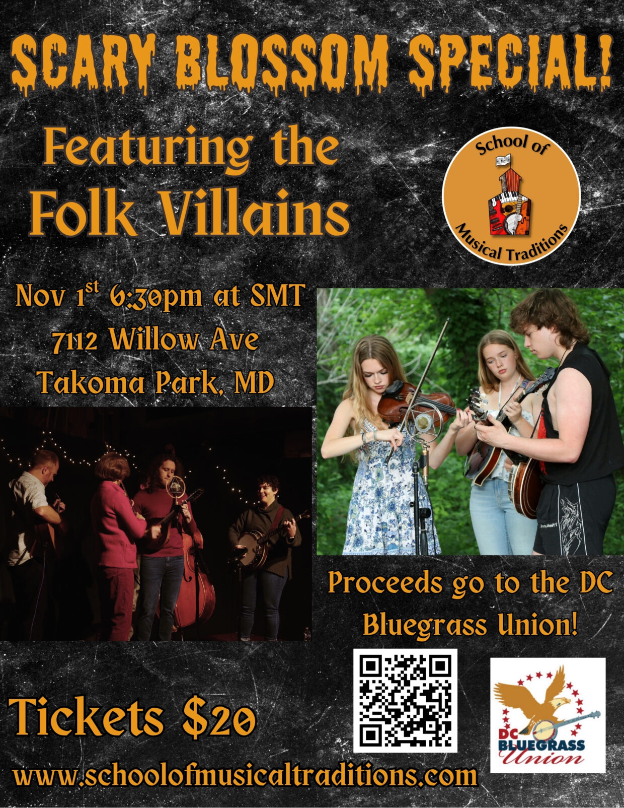 Get your ghoul on with murder ballads and spooky pop songs – CBS style! Cherry Blossom Special is hosting a Halloween concert featuring the Folk Villains! Proceeds from the event will be donated to the DC Bluegrass Union to help fund the Mike Auldridge Instrumental contest and educational initiatives that aim to keep the DC bluegrass scene thriving for the next generation.